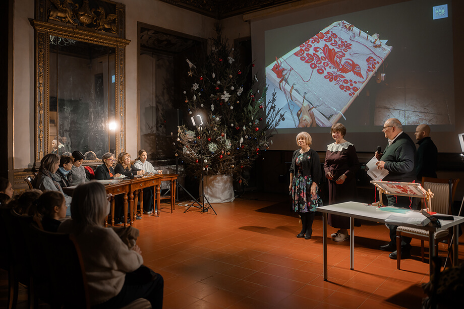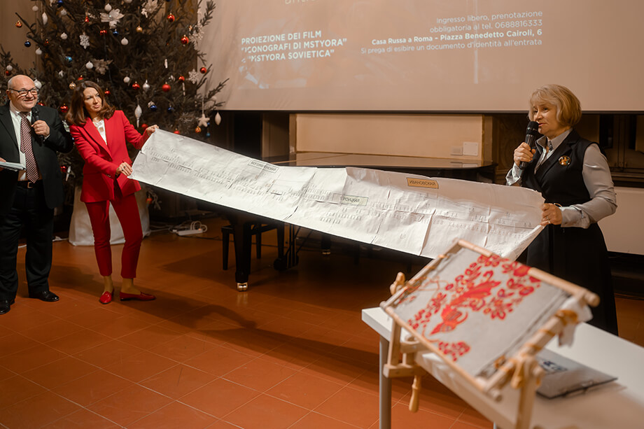 Присутствовавшая на выставке вышивальщица с 40-летним стажем и член союза художников России Нина Пчелякова, провела для гостей мастер-класс по традиционной мстёрской вышивке, а культуролог и куратор выставки Марина Каримова показала публике свои документальные фильмы «Иконописцы Мстёры» и «Мстёра советская», раскрывающие преемственность художественных традиций от древнерусской иконописи до искусства XX века. Это были первые показы за пределами России фильмов о Мстёре, переведённых на итальянский язык. «Я начала собирать артефакты культурные, связанные со Мстёрой, потому что это представляет историческую и культурную ценность. И большинство экспонатов на этой выставке из моей коллекции, но это, наверное, 1/5 часть. Я хотела показать этими экспонатами многогранность Мстёры, какими она обладает талантливыми людьми, сколько здесь разных направлений творческих», – рассказала Каримова.