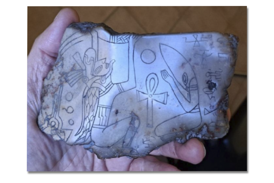 Итальянский исследователь Альберто Донини и его швейцарский коллега Томас Хрико обнаружили весной прошлого года во время раскопок три новых объекта, два из камня и один из глины, с изображениями инопланетян и летающих тарелок. Один из объектов носит на себе выдолбленные в камне изображения группы инопланетян с длинными шеями, яйцеобразными головами, огромными миндалевидными глазами и руками с тремя пальцами, над которыми висит летательный аппарат в форме тарелки. Другой каменный артефакт имеет форму ноги с четырьмя пальцами, на котором предположительно изображено перемещение мёртвого инопланетянина на космический корабль. Глиняная статуэтка изображает «инопланетного идола» – благодаря своей композиции именно этот объект учёным удалось датировать в занимающейся похожими случаями частной исследовательской лаборатории.